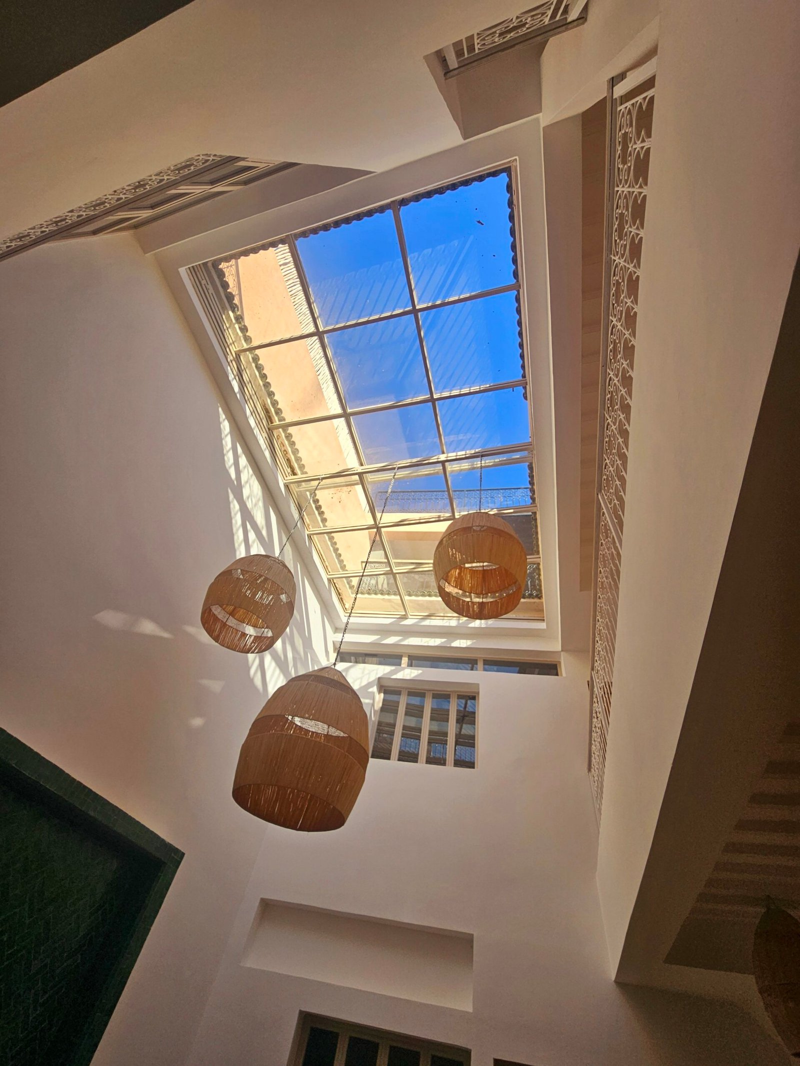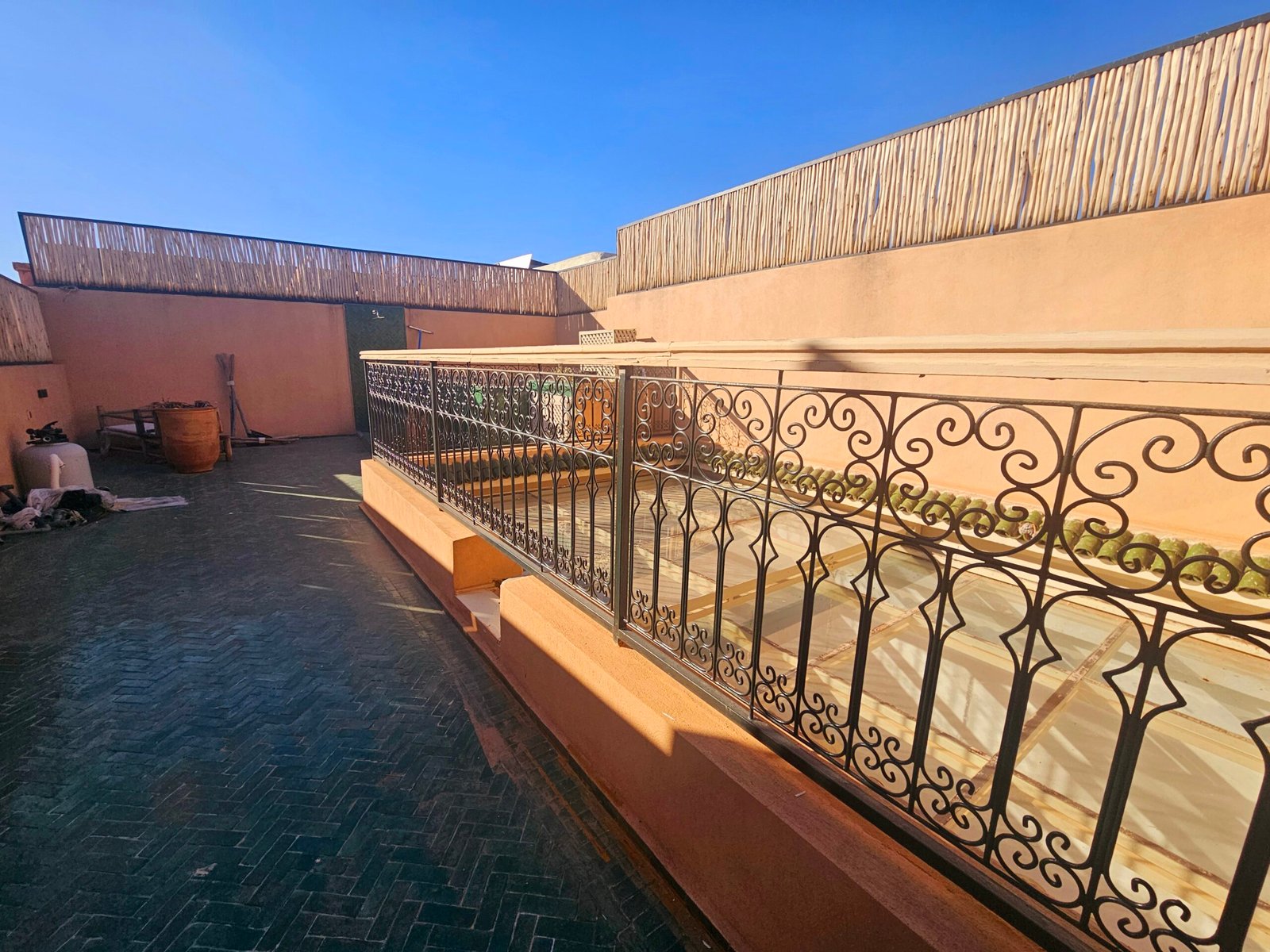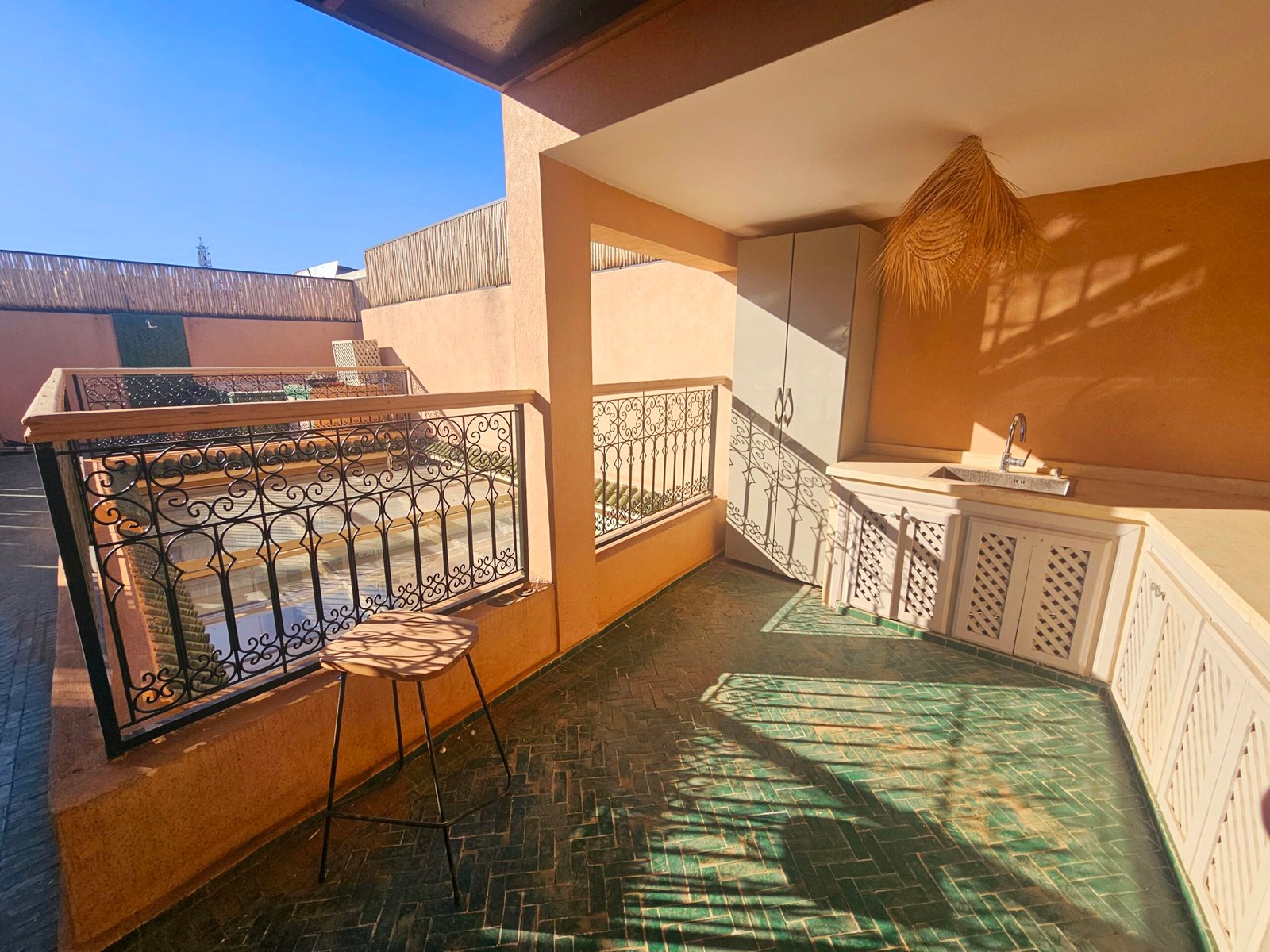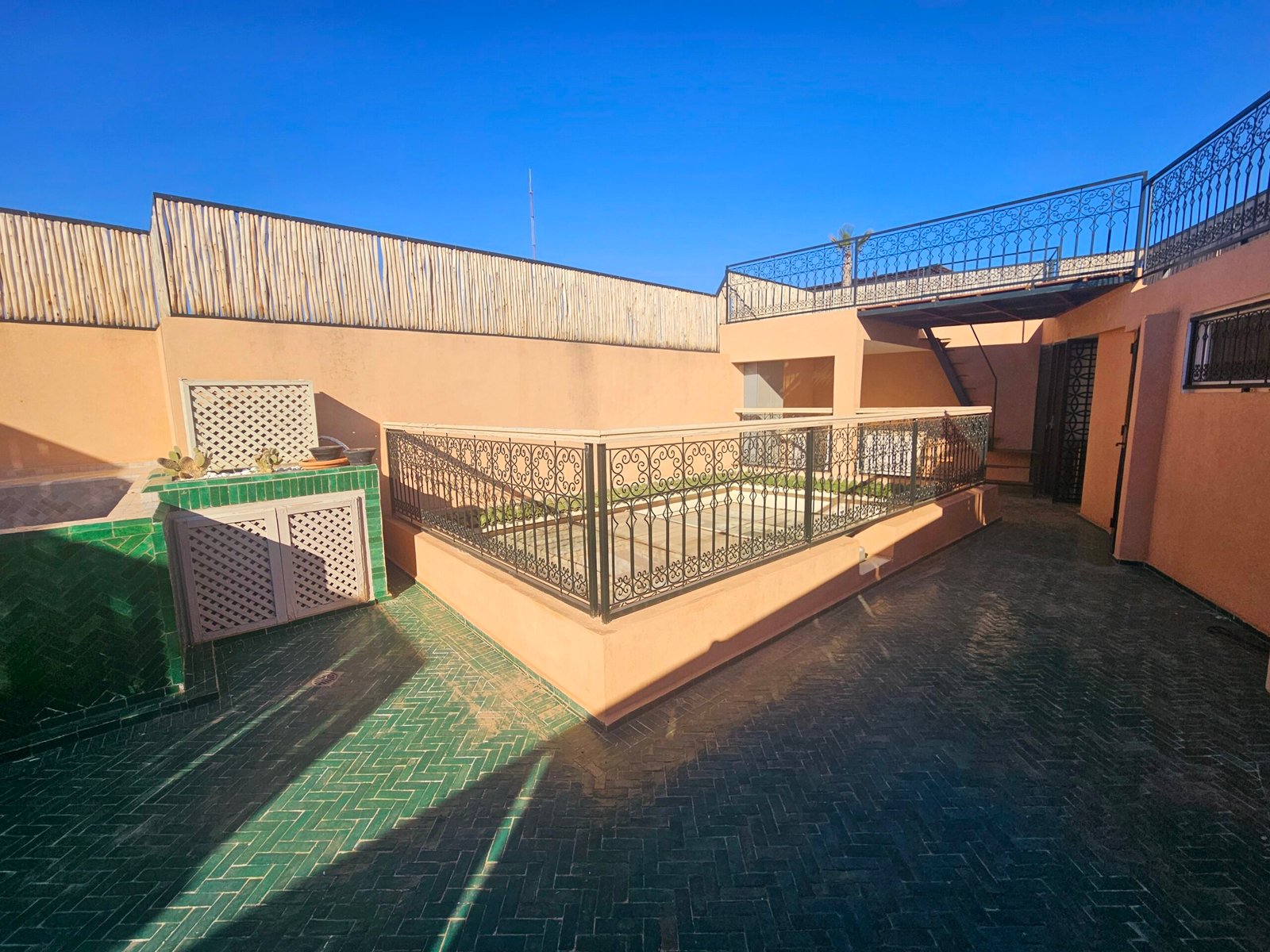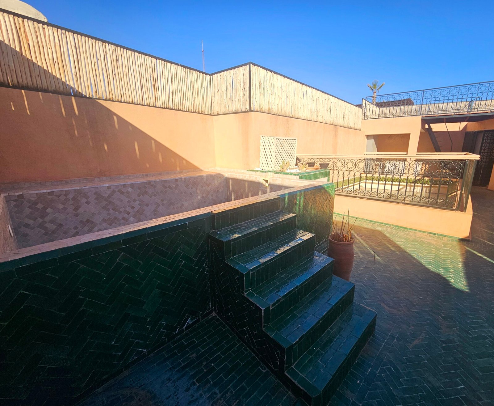 Ce riad de 4 chambres se distingue par sa qualité de construction et ses finitions soignées : portes à galandage, toit rétractable, bassin en rooftop et prestations contemporaines parfaitement intégrées à l’architecture traditionnelle.