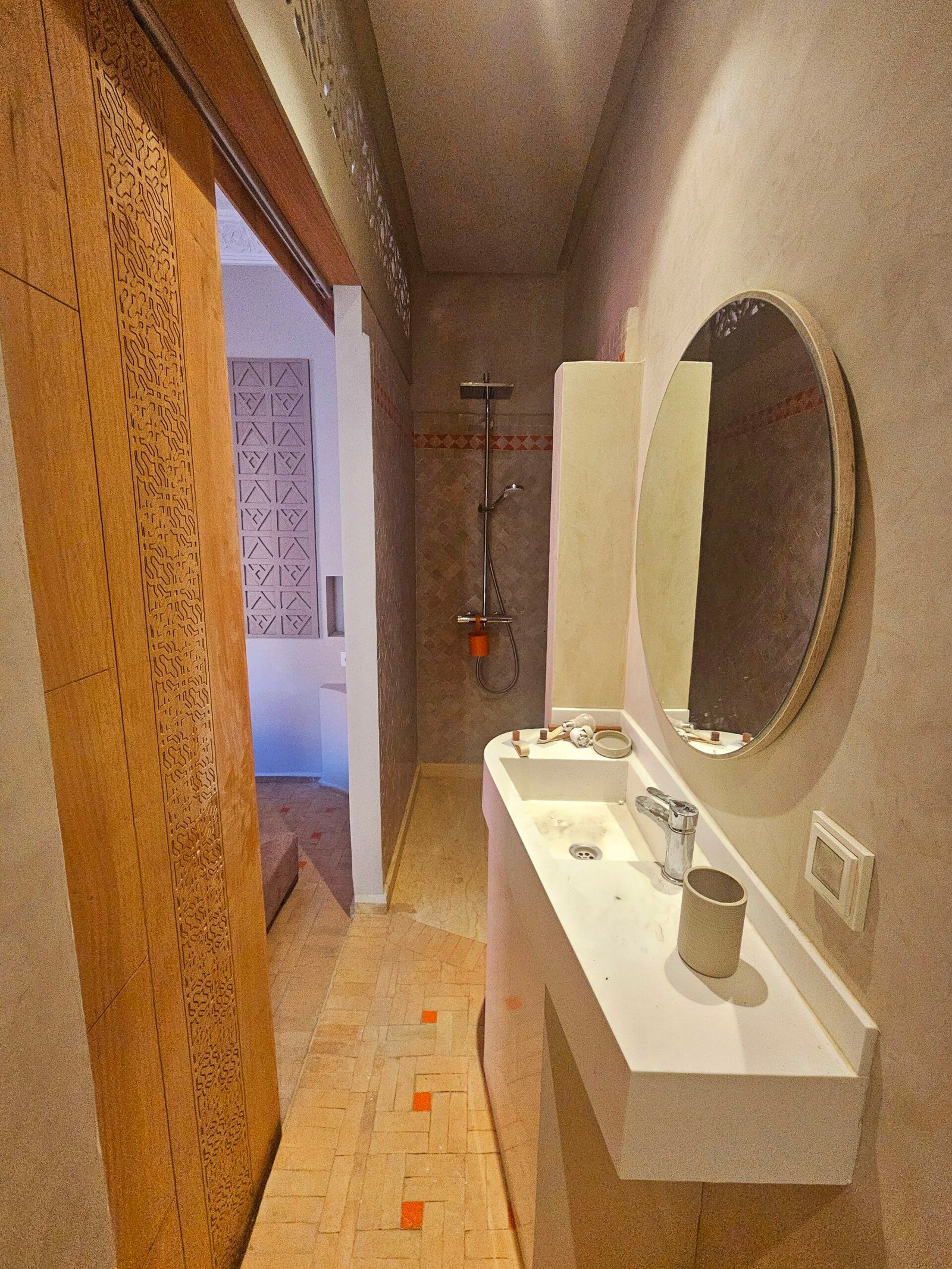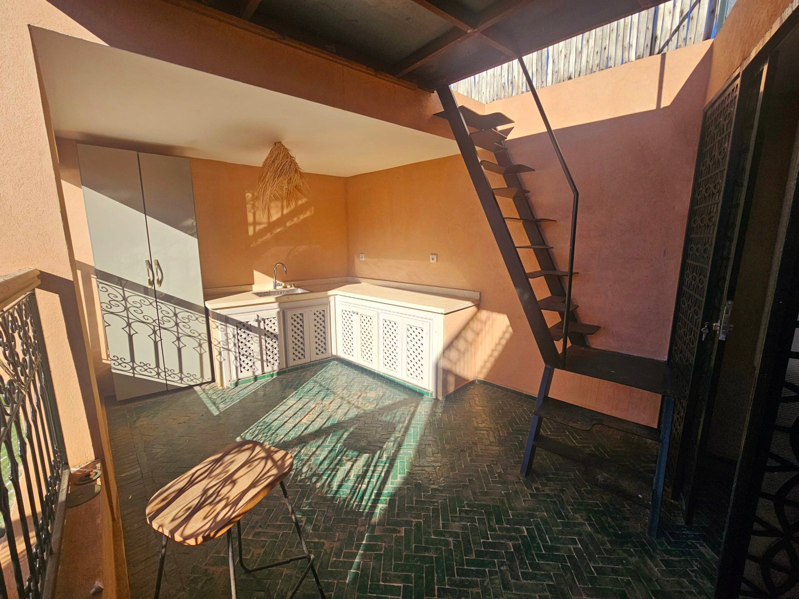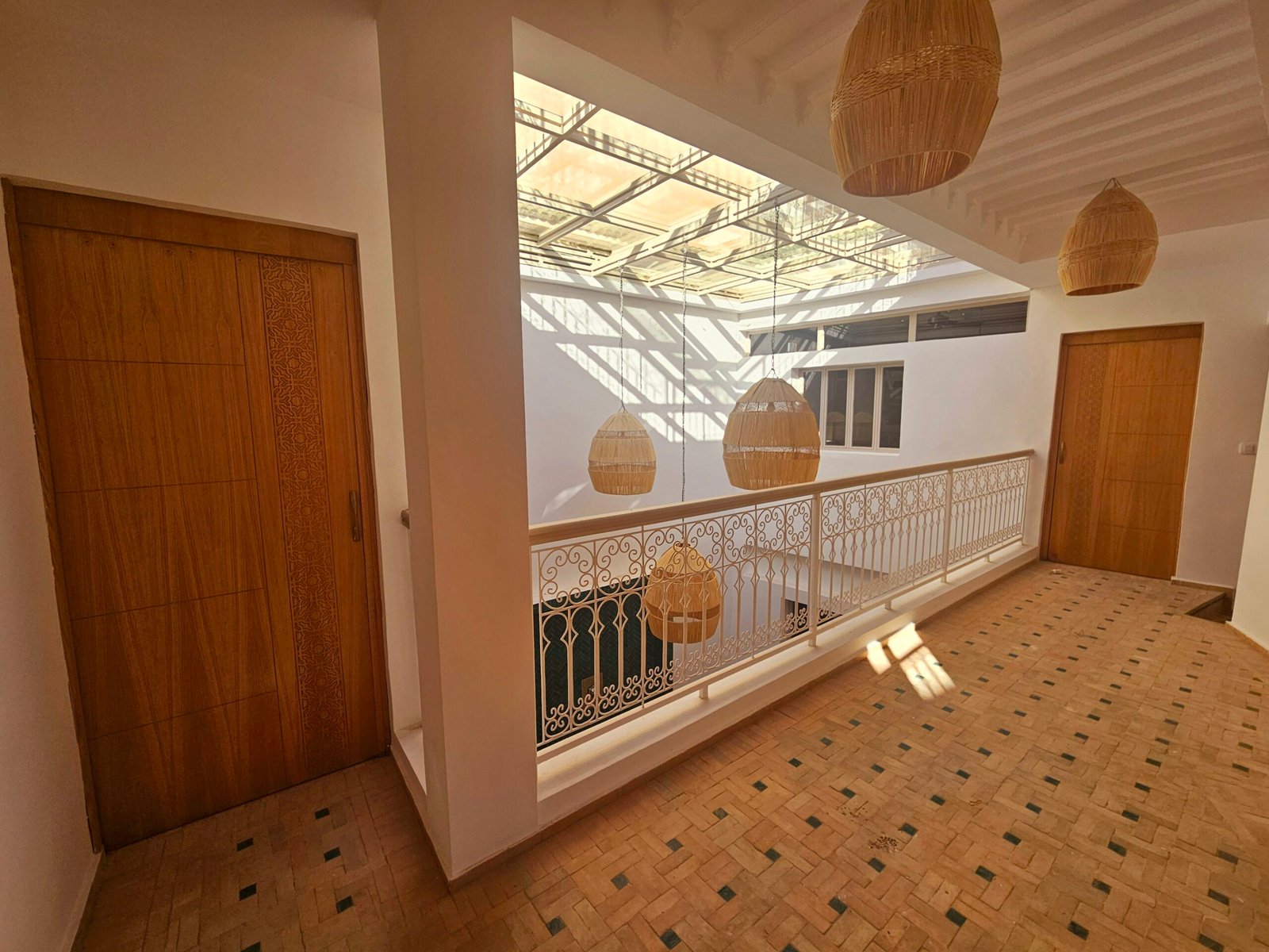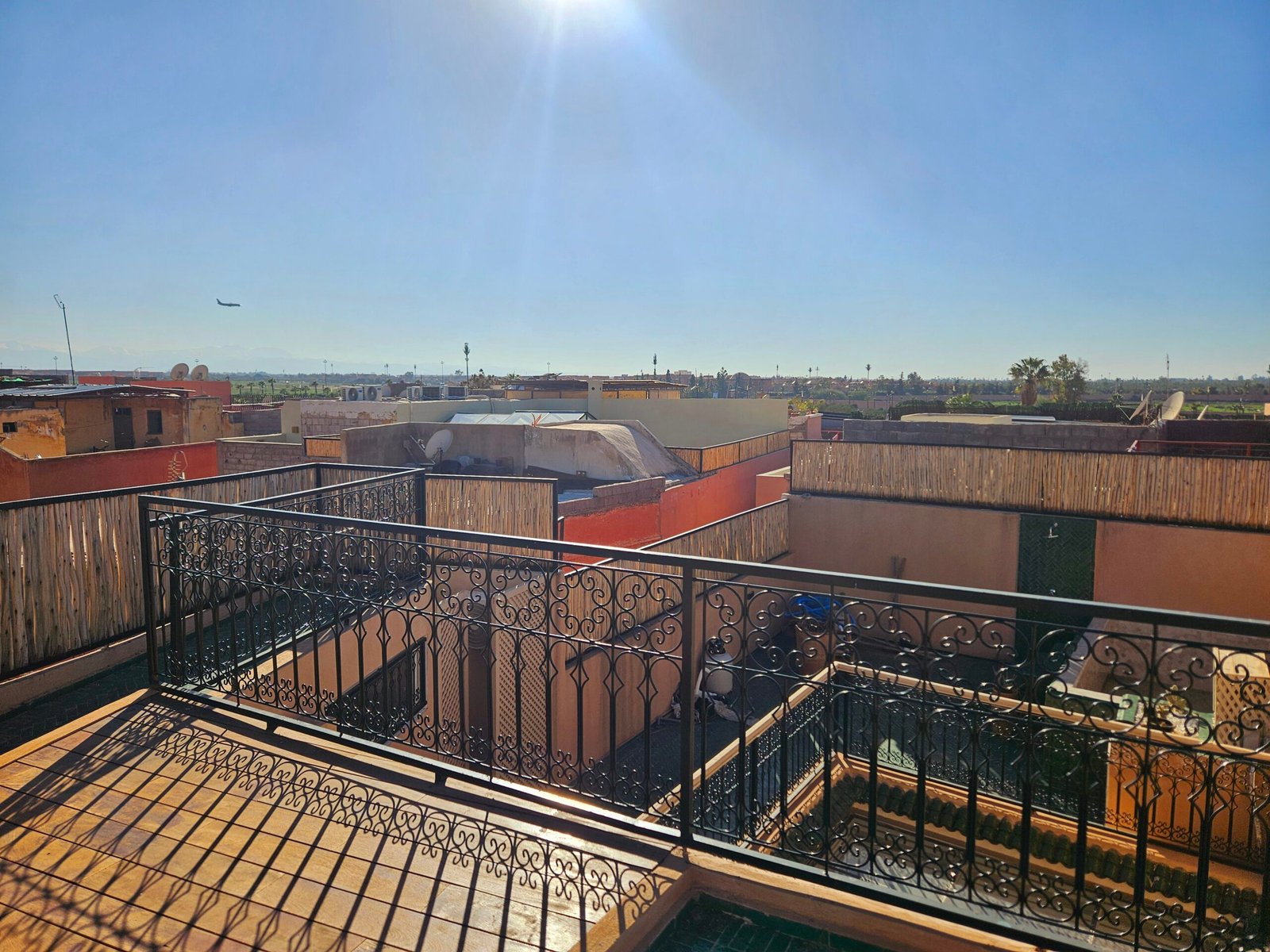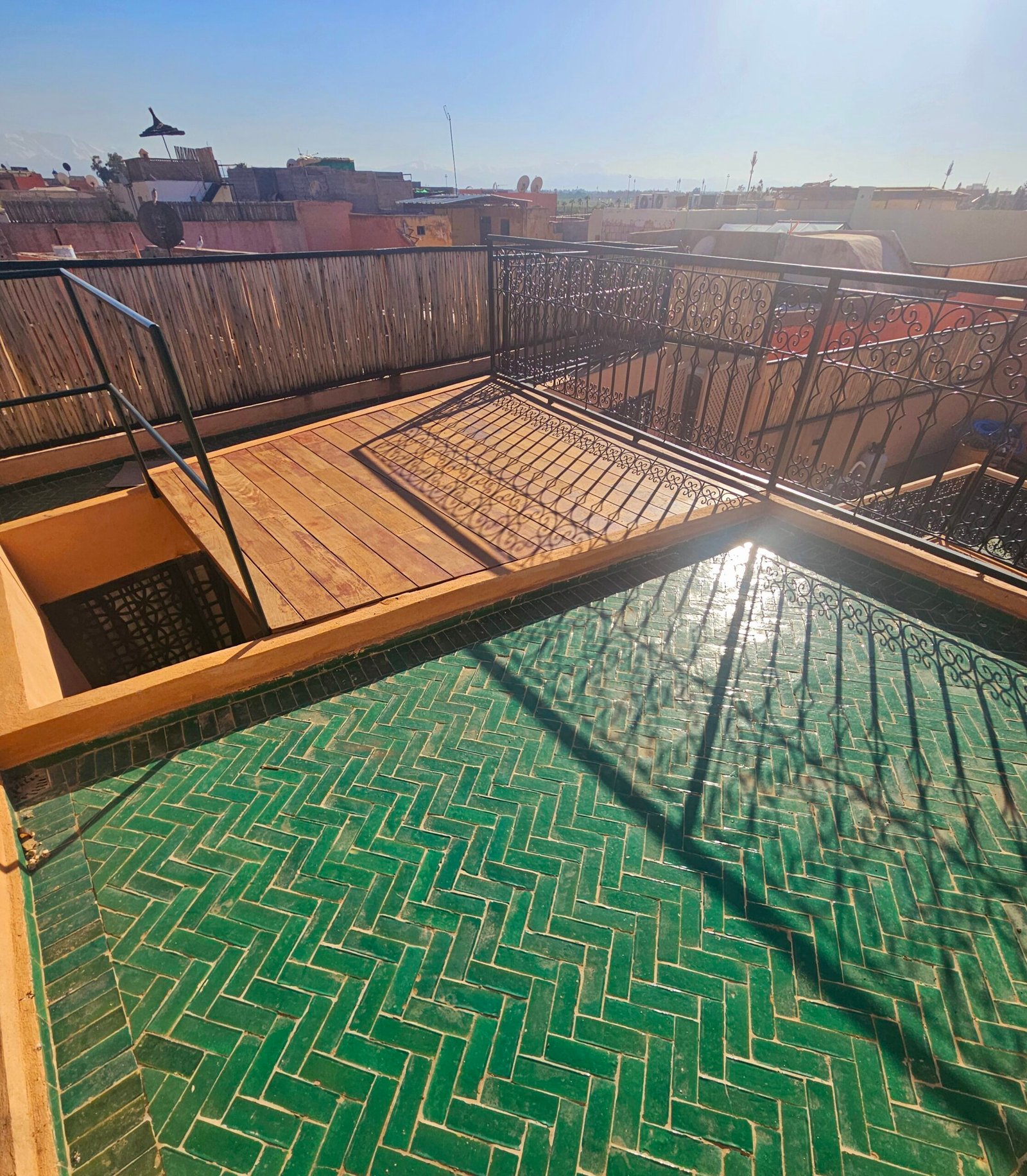 Ce riad de 4 chambres se distingue par sa qualité de construction et ses finitions soignées : portes à galandage, toit rétractable, bassin en rooftop et prestations contemporaines parfaitement intégrées à l’architecture traditionnelle.