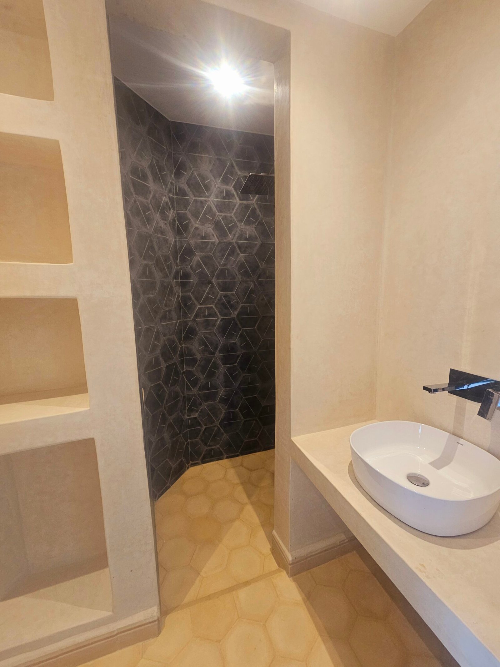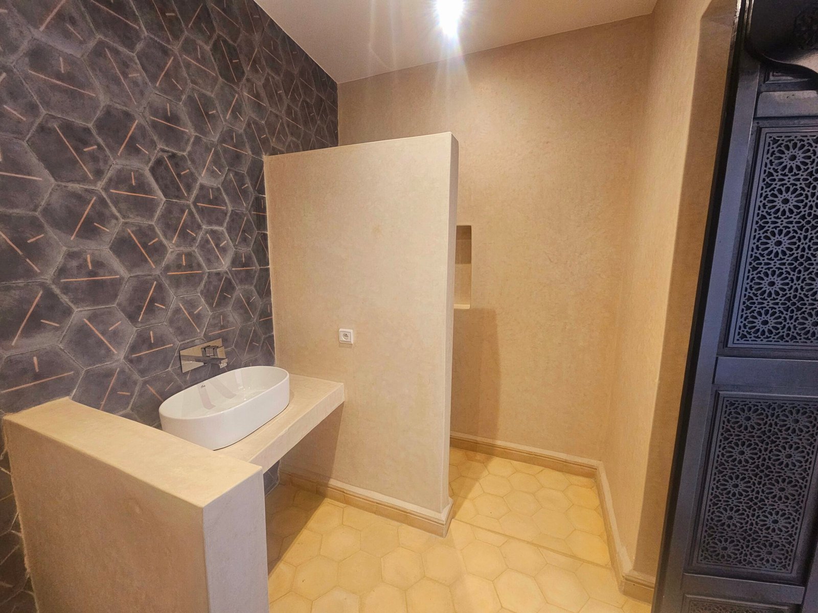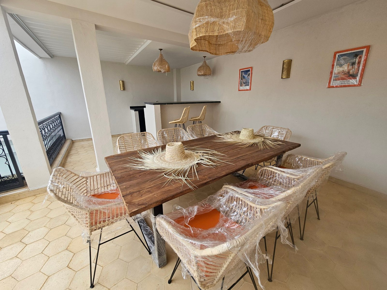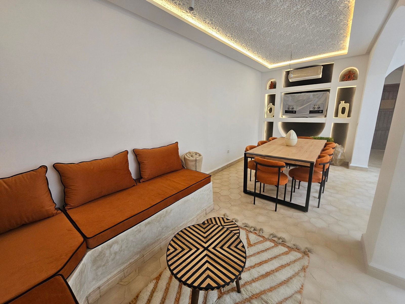 Son style marocain épuré, aux teintes blanches et neutres, constitue une toile parfaite pour une décoration raffinée.