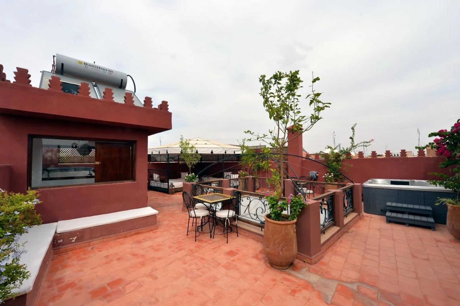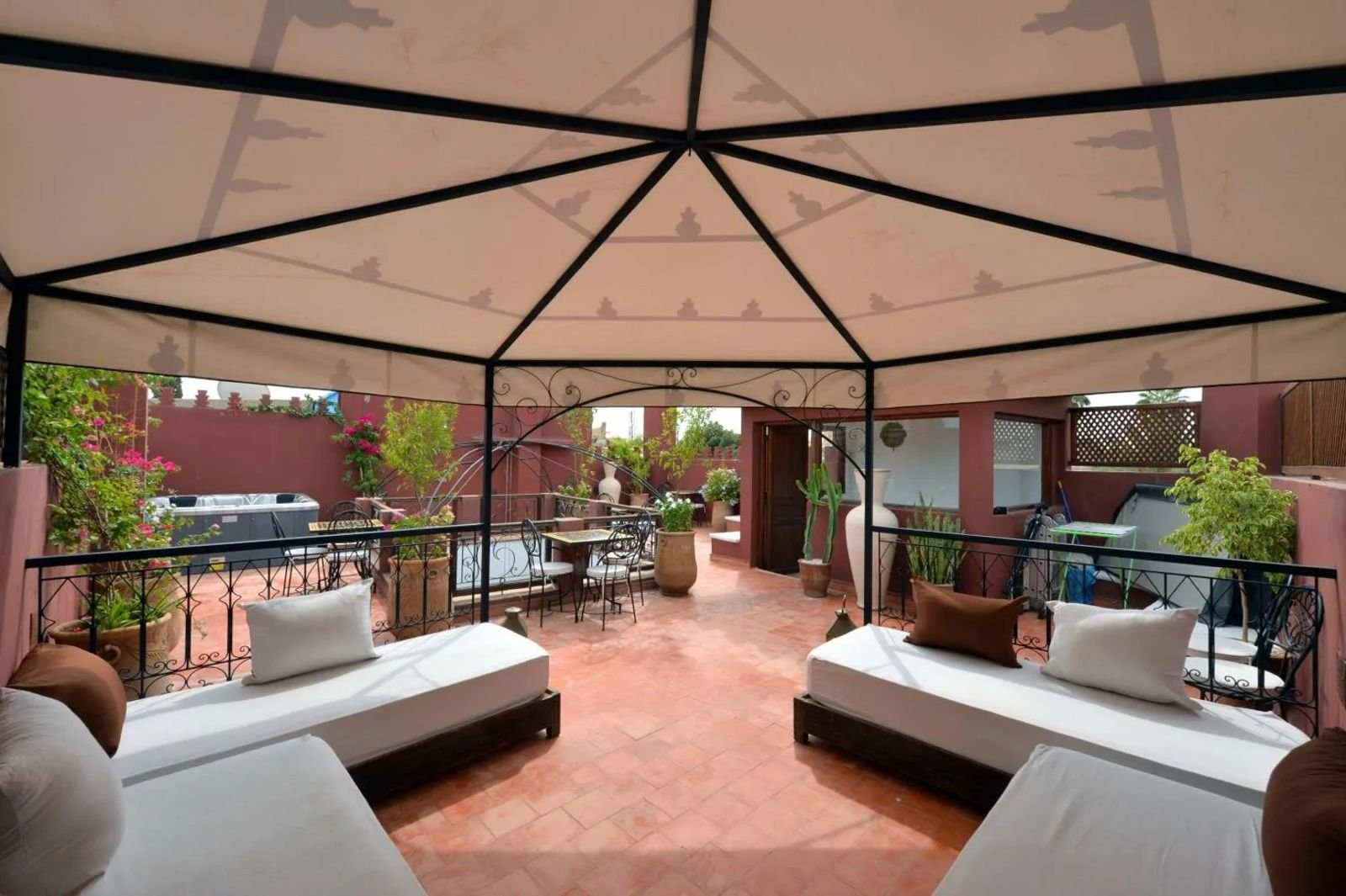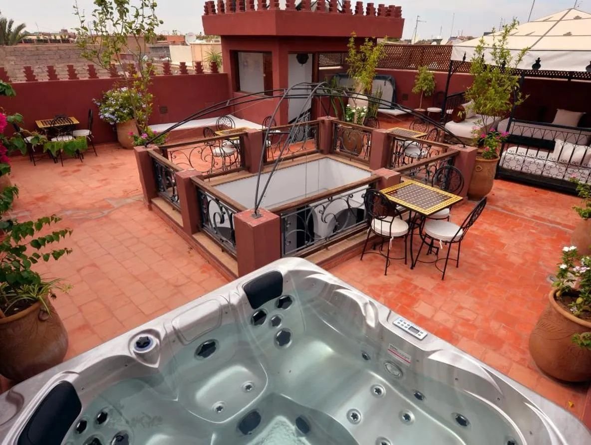Le riad dispose également d’un roof-top aménagé avec jacuzzi offrant une vue dégagée sur la médina.